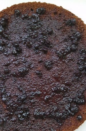 蓝莓果酱用少许雪碧调匀到能涂开的程度,均匀地抹在蛋糕片上。这是中间的夹层