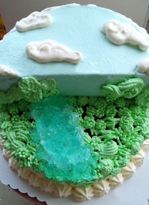 烤蛋糕的同时做雪碧果冻。将雪碧用小火加热到稍烫手的程度,倒入用少许冷水融化了的吉利丁粉和一滴蓝色色素,拌匀到完全溶解后,倒入容器放在冰箱中冷却到凝固