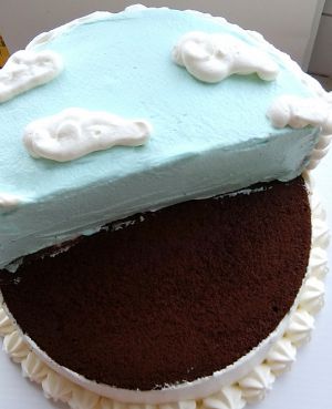 取少许奶油,加一滴蓝色色素调匀后,将上层半圆的蛋糕抹平。用圆孔裱花嘴挤出白云。用八角花嘴挤出底边装饰