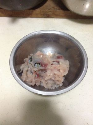 将腌制好的鱼丝,蘸上干淀粉,一定要将鱼丝均匀蘸上淀粉,否则炸制过程中,鱼丝会结块。