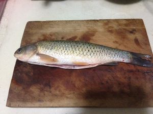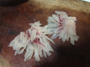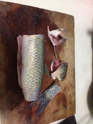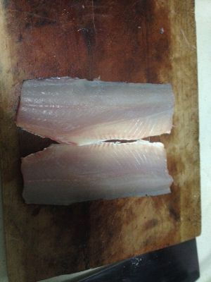 切去鱼头和鱼尾,鱼腮,抽出鱼线。
