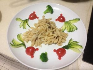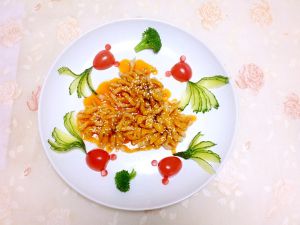将糖醋汁浇到鱼丝上,撒上熟芝麻,菊花鱼就做好了。