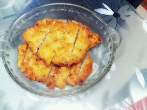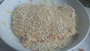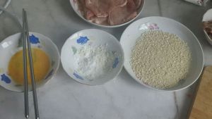 准备好材料,面粉可以放在砧板上,涂到肉上比较方便。然后再用手把面粉拍到肉上。弄好后,放在鸡蛋液里沾一下,最后放面包糠里过一下