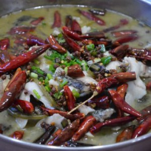 重新起油锅,将花椒,辣椒,葱姜蒜爆香最后倒入烧好的酸菜鱼汤中即可。
