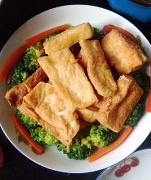豆腐炸完后,放漏勺控油(增强豆腐口感),放置西兰花上。