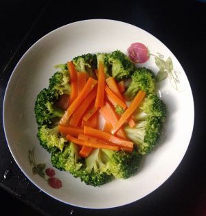 西兰花切小朵,胡萝卜切条焯水放盘里做配菜。(摆放喜欢的造型,胡萝卜也可切成图案吸引小朋友注意)