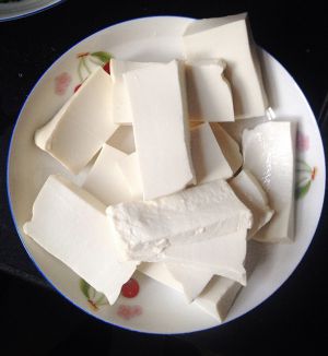 老豆腐切成一厘米厚度方块。锅烧热倒油,油温七八成热,将豆腐放入锅内炸至金黄(中大火炸,豆腐不要一次全放)