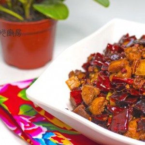 下葱姜爆香,下冰糖和炸好的鸡肉块同炒。翻炒2-3分钟后,放入花椒和过油后的干辣椒,用中小火翻炒2分钟。待锅中的油汁被干辣椒吸收得差不多时,下芝麻翻炒均匀出锅。