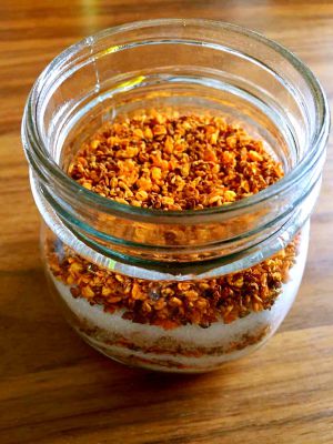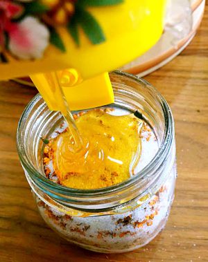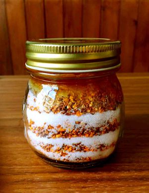 一层桂花一层细纱糖铺在玻璃罐子里。