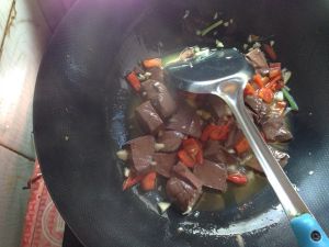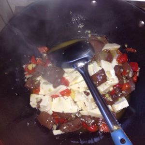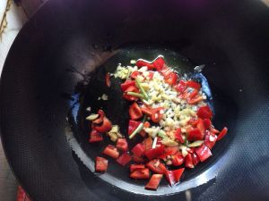 放油炒香葱白,姜蒜,辣椒,全部下锅翻炒片刻