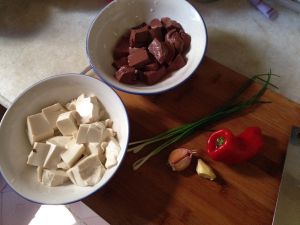 准备食材,豆腐我用的是南豆腐,也有人叫水豆腐,孩子吃着比较嫩一点,将豆腐和猪血切块,分开装,葱切段,蒜姜切末,辣椒切小块。备用