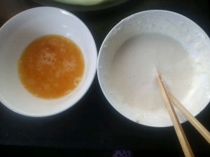 两个鸡蛋放适量盐打散,面粉。普通面粉半碗,倒入水,搅成面糊糊