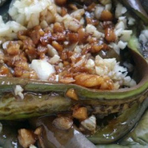 浇至茄子上,拌开[茄子的口感应该软软的]