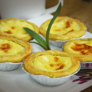 将冰冻的蛋挞皮取出小心拆开,摆放烤盘上,倒入蛋糕液;