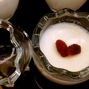 加热后的牛奶倒入容器中,放在通风处等待奶皮的形成。(这一层的奶皮是靠鲜牛奶的热气往上顶而形成的奶皮。)