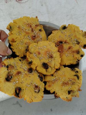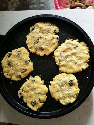 平底不粘锅烧热, 用手拍成薄饼,洒上适量白芝麻