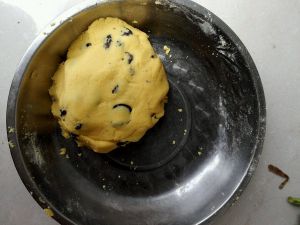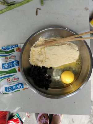 首先准备玉米粉100g,鸡蛋一个,黑提子干30g,纯牛奶