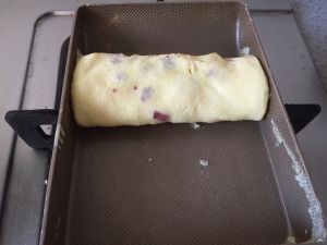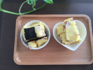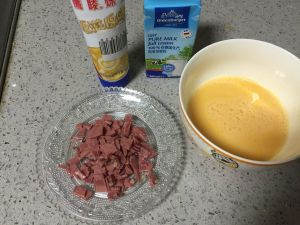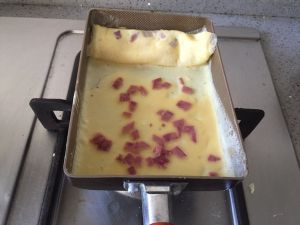 火腿切好与鸡蛋液混合倒入不粘锅 分三次煎