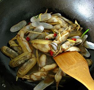 烹入料酒,加盐、生抽、白糖炒匀,等蛏子壳张开后即可出锅装盘。