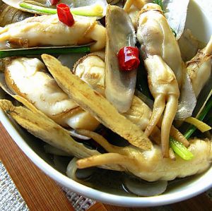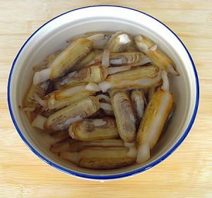 蛏子放入淡盐水中浸泡1个小时,使蛏子吐尽泥沙。再用牙刷刷洗干净滤水。