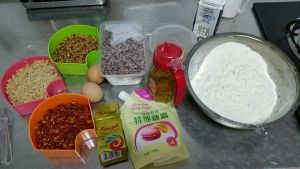 将牛奶温热倒入碗中,放入酵母搅匀静置10分钟,和糖鸡蛋一起倒入面粉中搅拌成絮状。(留半个蛋黄用来刷表面)