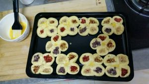 将蛋黄刷到表面,170度火预热5分钟,放入中层,20分钟左右。