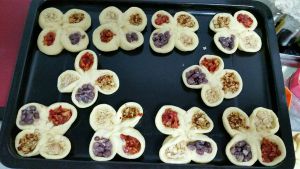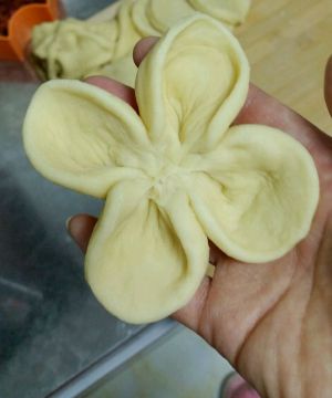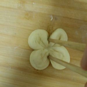 反过来用大拇指压成四个窝窝,把配料放进去。