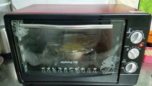 烤盘内放热水,盖上保鲜膜,发酵40-50分钟,手在面团上按下窟窿不起来就可以。