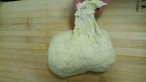 放到案板上用搓衣服的方式揉,边揉边摔打,大约20分钟直到可以拉开筋膜。