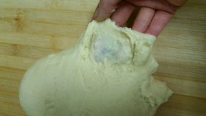 将面团拉开油倒入继续揉摔约20分钟,可以撕开透明的筋膜,扩展完成。