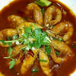 中火锅里放入少许油,再加入备用的调料炒香加入200克左右的,高汤,鸡汤,水都可以,调味加入,少许的盐,鸡精,味精,东古酱油烧开用密漏打捞出渣子,再加入腌制好的虾,(虾我个人喜欢用油炸了在煮,酒店都是炸过的)做熟连汤一起乘入有豆芽的容器中,洒上少许蒜末,干辣椒,芝麻,锅烧烫,加适量油,烧至冒青烟,淋虾上,洒上香菜即可。