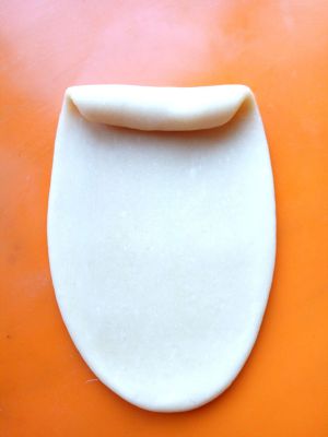 按扁后小心擀成牛舌状,可以看到中间深色的部分就是油酥。擀的时候用力要均匀,以免破皮