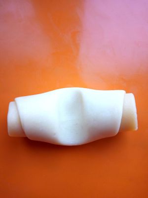 饧好的面卷压扁,擀成长条,再卷成卷。这时的长条更细更长
