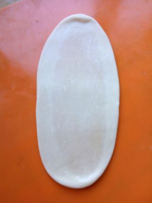 用擀面杖擀成中间稍厚,四周稍薄的圆饼