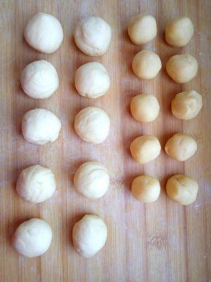 将松弛好的水油皮(大面团)和油酥(小面团)用厨房秤分成若干等份