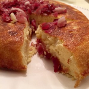 把土豆捣碎,但要留一些小块,和蛋液拌在一起。