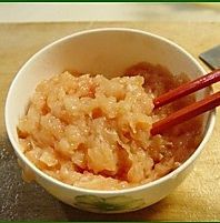 鸡肉洗净,先片成薄片,再切细丝,最后改刀成米粒状;青红椒切粒,用厨房纸吸干水份、生姜剁细末,鲜剁椒与豆瓣酱再剁细