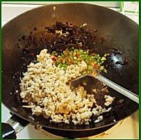 锅内热油,八成热时,下入鸡肉,滑散至变色,捞起备用