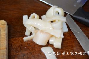 新鲜鱿鱼去皮,切成鱿鱼条,热水汆烫30秒捞出