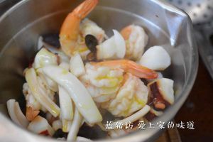 海虾去皮,加入一点点盐和糖(分量外)腌制10分钟,烧一锅热水,汆烫1分钟捞出