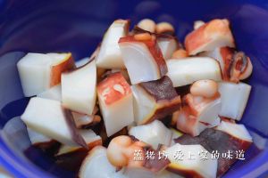 章鱼足切成一口大小的快,热水汆烫30秒捞出