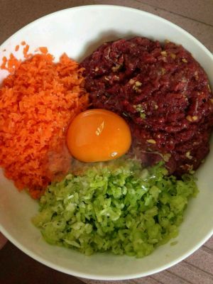首先将牛肉芹菜胡萝卜剁碎加入鸡蛋一个