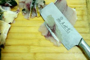 接下来把两边的鱼肉,用斜刀片成薄片,清洗一下备用