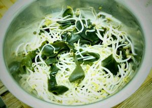 取水烧开加入适量盐、料酒将豆芽焯一下大约30秒,倒入容器备用