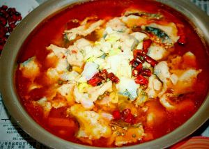 锅中倒入底油加姜片炒香后加入豆瓣酱、火锅底料、料酒,炒出红油后加水大火烧开,烧开后把料渣捞出,接着下入鱼头、鱼块,开锅后煮两分钟捞出,开锅后改小火放入鱼片,水开后调味加入少许盐、白糖、鸡精、白胡椒粉待鱼片全白后捞出