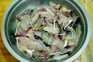再把鱼片放入盐、鸡精、白胡椒粉、料酒顺时针搅拌均匀在鱼片起粘稠时加入淀粉、色拉油继续搅拌均匀,再加一点色拉油