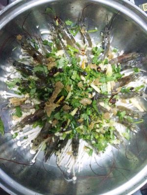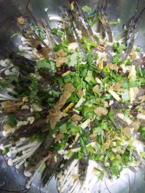 先加一点油,铺上金针菇,把虾线抽出,铺在金针菇上面,加上蒜蓉,姜丝,葱与香菜
