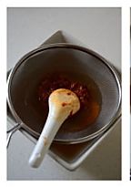 把韩式大酱和辣椒酱混合,放在筛网上,用汤匙按压,过滤。