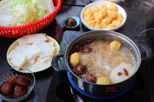熬好之后,可以放入各种美食下锅,这时候就可以在家享受香辣火锅。