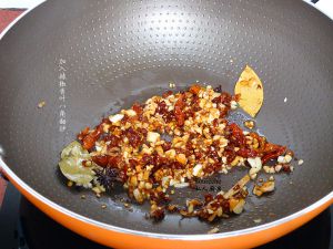 热锅,倒油,爆香切碎的香菇脚、蒜末爆香;PS:香菇是等会用来火锅吃的,把香菇脚用爆香;